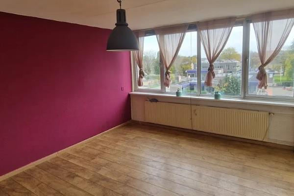 3e verdieping entree, hal, meterkast, doucheruimte met toilet, ruime woonkamer en halfopen keuken met keukenblok, deur naar balkon.