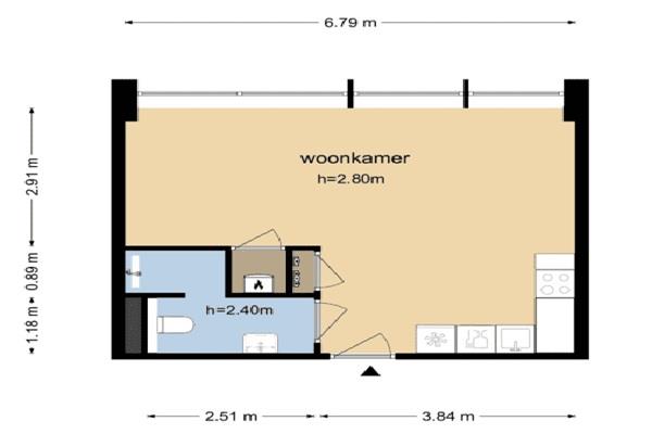 Deze studio is gelegen op de eerste verdieping. Bij binnenkomst stap je binnen in de keuken en woon/slaapkamer. De deur van de badkamer bevind zich naast de entree. De keuken is voorzien van inbouwapparatuur (koelkast, kookplaat, afzuigkap en combimagnetron), de badkamer is voorzien van inloopdouche, wastafel en toilet.