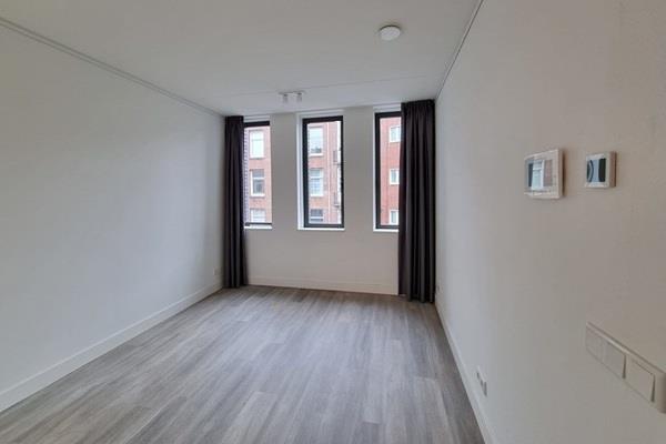 Aan de voorzijde is de ruime en lichte studio met grote raampartijen en volledig ingerichte keuken (2-pits inductiekookplaat, magnetron, koel-vriescombinatie en vaatwasser.