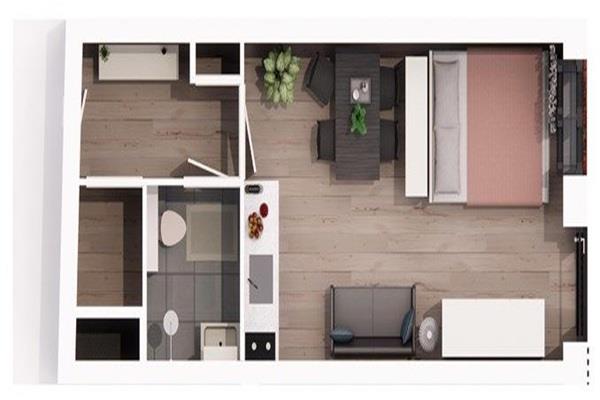 Entree in de gang, rechts is de CV-ketel ruimte met wasmachine aansluiting, aansluitend de badkamer met inloopdouche, wastafel met meubel met spiegel en het toilet. Aan de voorzijde bevindt zich de ruime en lichte studio met Frans balkon, grote raampartijen en keuken voorzien van 2-pits inductiekookplaat, microwave, watwasser en koel/vriescombinatie.