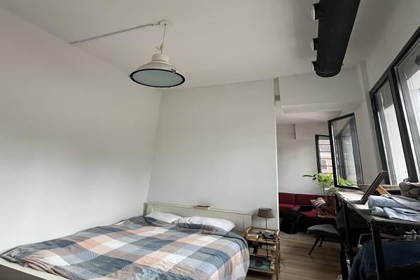 Via de hal zijn zowel de woonkamer met open keuken als badkamer te bereiken. Door het hoge plafond en de grote hoge ramen kent de woonkamer met keuken veel daglicht toetreding. De open keuken is voorzien van voldoende kastruimte, koelkast, kookplaat met afzuigkap en combimagnetron en wasmachineaansluiting. Via de woonkamer is de halfopen slaapkamer te bereiken, welke een oppervlakte van circa 12m2 heeft. De badkamer is betegeld en voorzien van toilet, douche en wastafel.