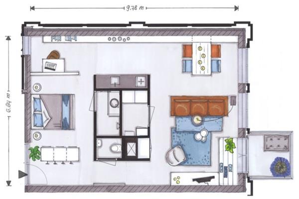 Je komt binnen in een stoere, industriële loft waarbij een centrale unit is geplaatst.