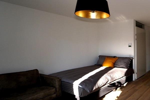 Gedeelde entree met brievenbussen, bellentableau, lift en toegang tot de gezamenlijke tuin. De studio is uitgerust met hip meubilair, oa. een tweepersoonsbed, linnenkast, tafel, stoelen, TV. De open keuken is voorzien met een kooplaat, afzuigkap, koelkast en magnetron. De volledig betegelde badkamer is voorzien van een douche en wastafel met spiegel.