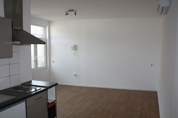 Woon/slaapkamer (circa 25m2) met modern keukenblok en laminaatvloer. Het keukenblok is v.v. voldoende kastruimte, koelkast, 2-pits elektrische kookplaat en afzuiging.