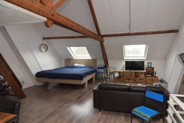 Via de gezamenlijke entree heb je toegang tot de deur van dit welke op de tweede etage gelegen is. Direct ga je met de trap omhoog en kom je binnen in de hoge open ruimte. Vanuit het woongedeelte heb je toegang tot de keuken, (slaap)vide en badkamer. Het woongedeelte is voorzien van een laminaatvloer.