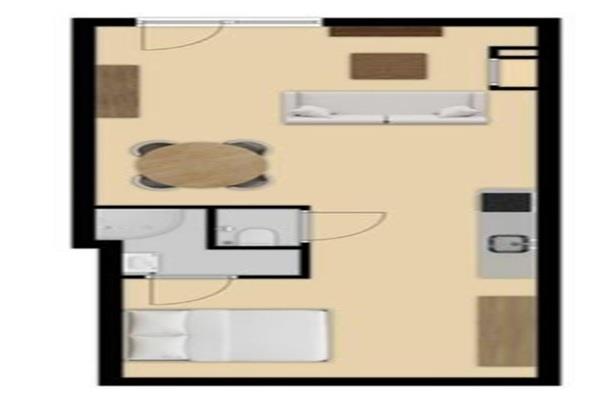De open slaapkamer is gelegen aan de achterzijde van de woning en bereikbaar via de keuken. En biedt voldoende ruimte voor een 2-persoonsbed en kledingkast.