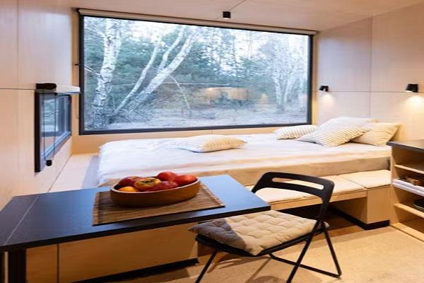 Woon-/slaapgedeelte met een comfortabel kingsize bed en een groot panoramisch raam